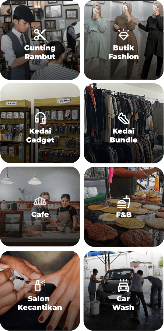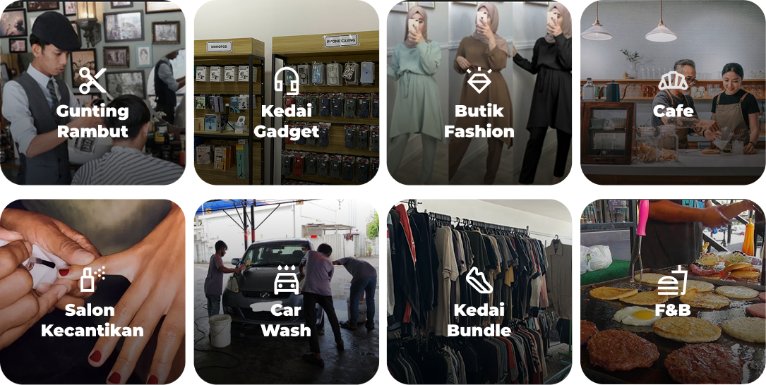 Vendor kami merangkumi pelbagai kategori seperti kafe, kedai gunting rambut, bakeri, salun, cuci kereta, kedai buah, studio kecergasan, dan banyak lagi!