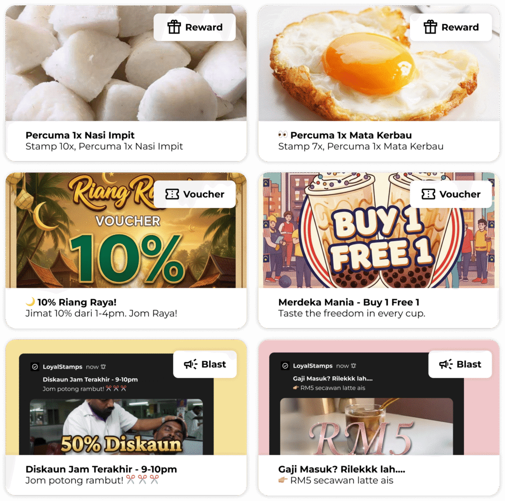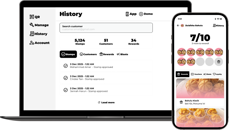 LoyalStamps berfungsi lancar dalam kedua-dua cara—tetapi kami menggalakkan customer menggunakan aplikasi untuk membuka ciri seperti Blast dan Voucher, yang membantu meningkatkan jualan berulang.